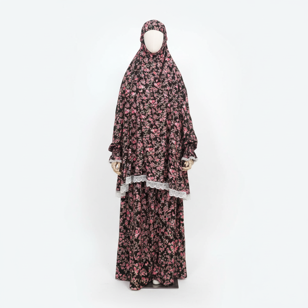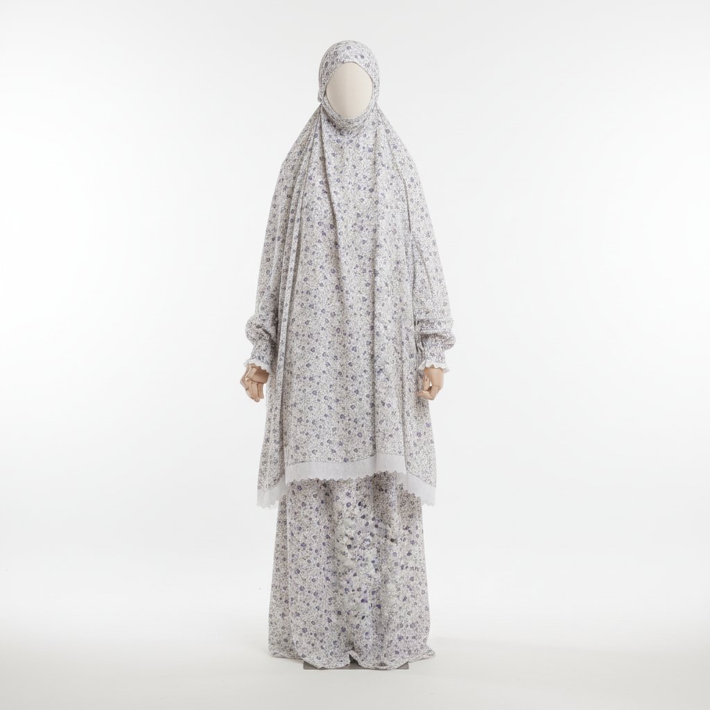Soft and modest prayer gown made from lightweight fabric, featuring a delicate white lace trim for an elegant touch — perfect for comfortable and graceful worship.
